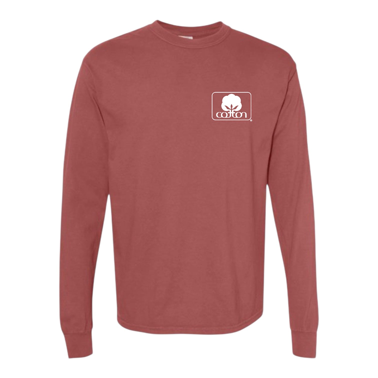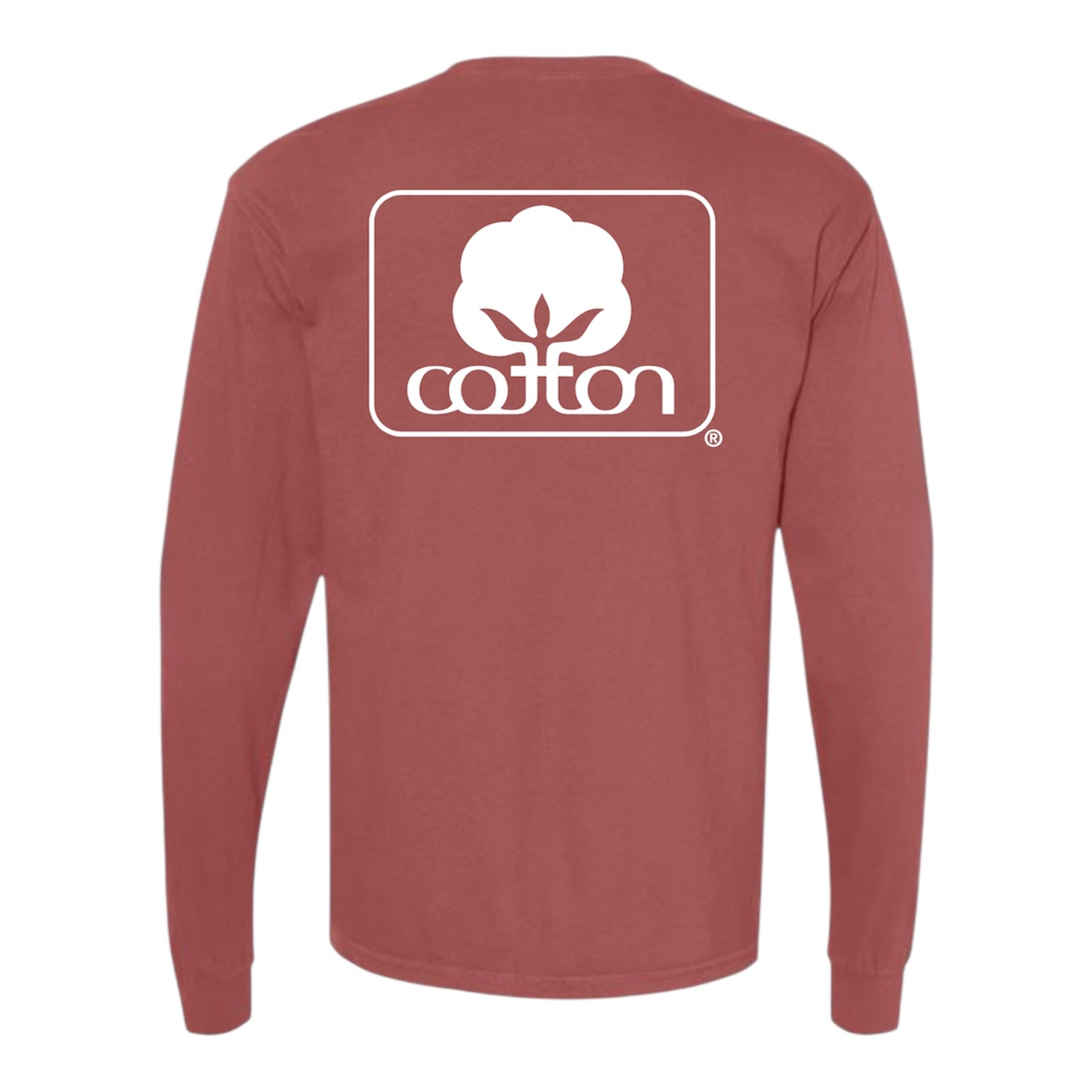 Long sleeve T-shirt made from 100% USA cotton. Garment-dyed for a soft and comfortable fit. Features a large white Seal of Cotton logo on the back and a small logo on the front left chest. Great for afternoons on the farm and everyday wear — proudly represents Cotton.
