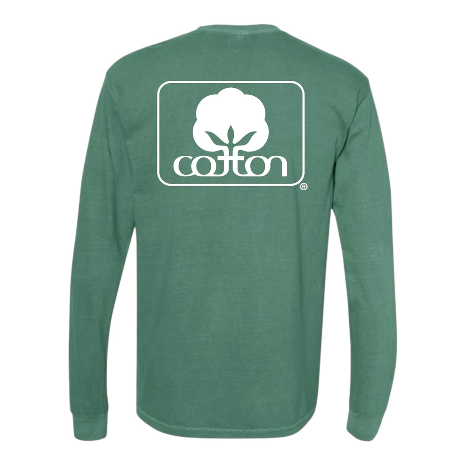 Long sleeve T-shirt made from 100% USA cotton. Garment-dyed for a soft and comfortable fit. Features a large white Seal of Cotton logo on the back and a small logo on the front left chest. Great for afternoons on the farm and everyday wear — proudly represents Cotton.