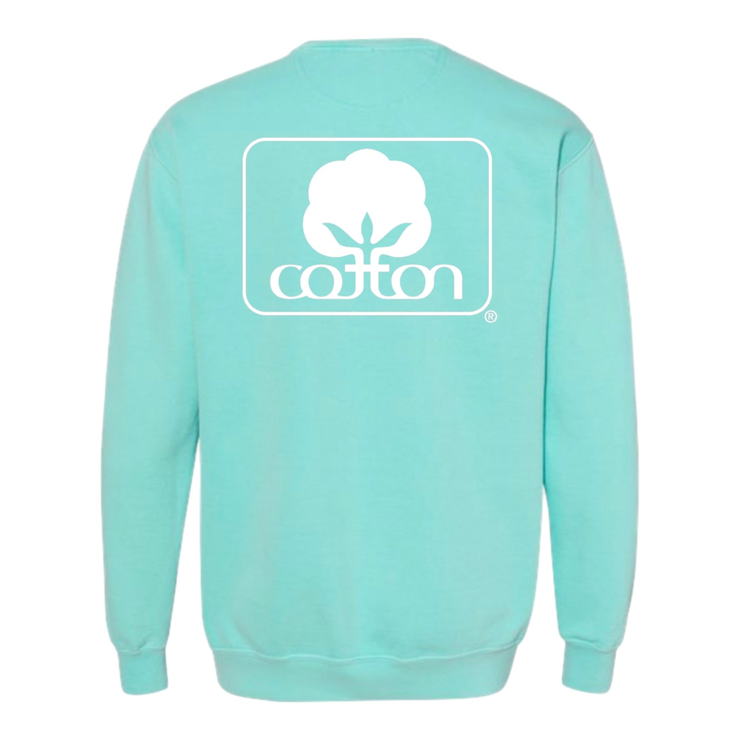 Heavyweight sweatshirt made from 80% USA cotton. Garment-dyed for a soft and comfortable fit. Features a large white Seal of Cotton logo on the back and a small logo on the front left chest. Great for everyday wear — proudly represents Cotton.