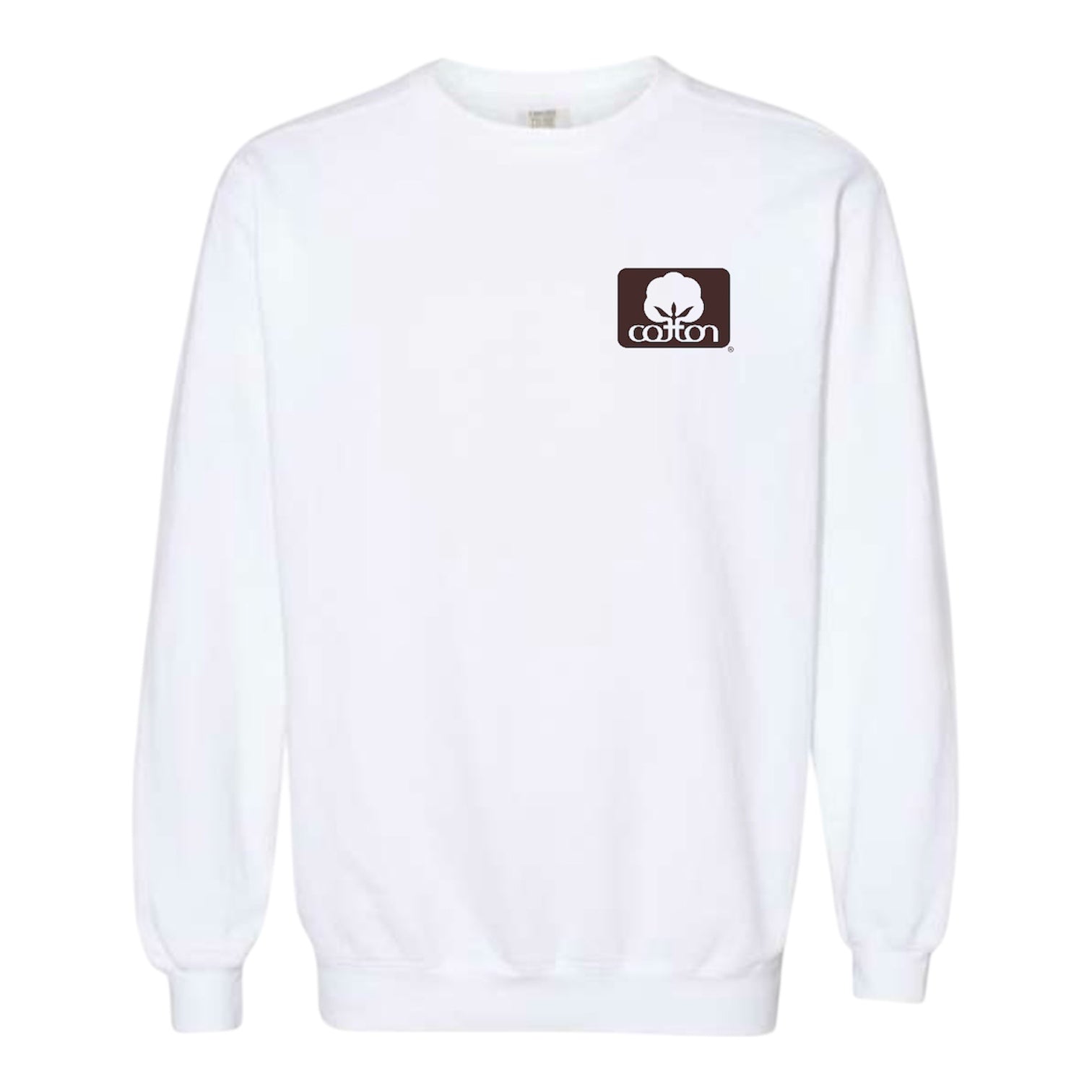 Heavyweight sweatshirt made from 80% USA cotton. Garment-dyed for a soft and comfortable fit. Features a large brown Seal of Cotton logo on the back and a small logo on the front left chest. Great for everyday wear — proudly represents Cotton.