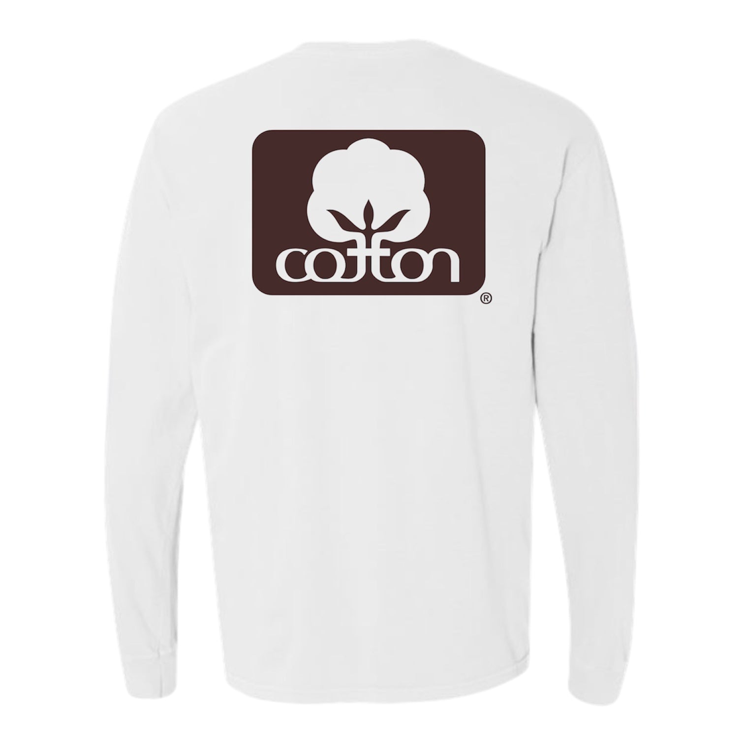 Long sleeve T-shirt made from 100% USA cotton. Garment-dyed for a soft and comfortable fit. Features a large brown Seal of Cotton logo on the back and a small logo on the front left chest. Great for afternoons on the farm and everyday wear — proudly represents Cotton.